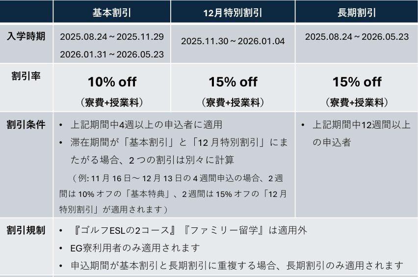 円安が続く状況の中、固定レートの採用や中長期留学における割引は大変ありがたいです♪