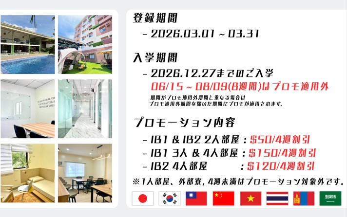 留学期間が上記プロモ適用外期間に重なる場合は適用外期間を除いた期間にプロモが適用されます。