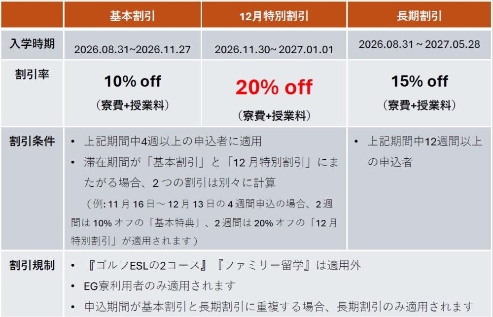 この期間までにお申し込みをすれば通常よりもお得に留学できるなんてこともあるので現在留学をご検討中の方必見です!