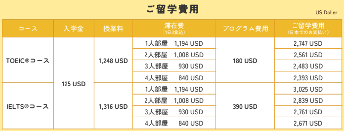 入学金、授業料、滞在費、食費、夏季ピークシーズン費用、公式試験費用、週末アクティビティ費用